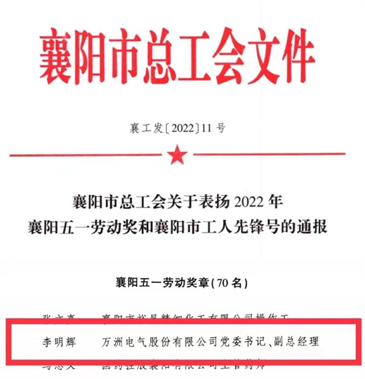 日前,從襄陽市總工會獲悉,萬洲電氣黨委書記、副總經理李明輝榮獲2022年“襄陽五一勞動獎章”稱號。