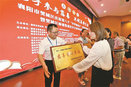 9月5日是我國(guó)第八個(gè)“中華慈善日”。當(dāng)日,由樊城區(qū)民政局等單位主辦的“攜手參與慈善 共創(chuàng)美好生活”2023年樊城區(qū)柿鋪街道“中華慈善日”宣傳活動(dòng)暨“樊城區(qū)柿鋪街道社區(qū)公益基金”啟動(dòng)儀式舉行。活動(dòng)現(xiàn)場(chǎng),區(qū)民政局向柿鋪街道授予“柿鋪街道·社區(qū)公益基金”牌匾,萬(wàn)洲電氣股份有限公司、湖北諾伯特科技有限公司等公司捐贈(zèng)1萬(wàn)元以上的愛(ài)心基金。