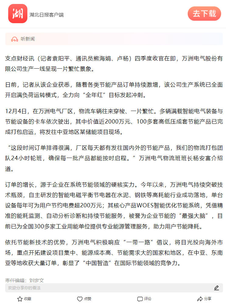 12月4日,在萬洲電氣廠區(qū),物流車輛往來穿梭、一片繁忙。多輛滿載智能電氣裝備與節(jié)能設(shè)備的卡車依次駛出,其中價值近2000萬元、100多套高低壓成套節(jié)能產(chǎn)品已完成打包啟運,將發(fā)往中亞地區(qū)某儲能項目現(xiàn)場。