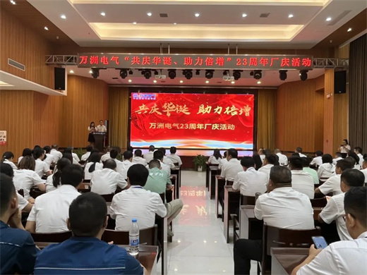 載懽載笑獻賀禮,歡聚一堂慶華誕。9月7日下午,在萬洲電氣一樓多功能廳,伴隨著莊嚴的國歌聲,萬洲電氣23周年廠慶活動拉開帷幕。